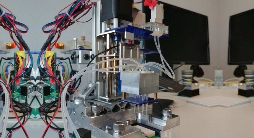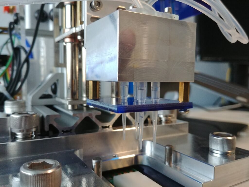 A team of engineers customized a mini CNC pen engraver to be used to automate pipetting and the testing of large volumes of silica nitrite nanopores and test strip consumables.