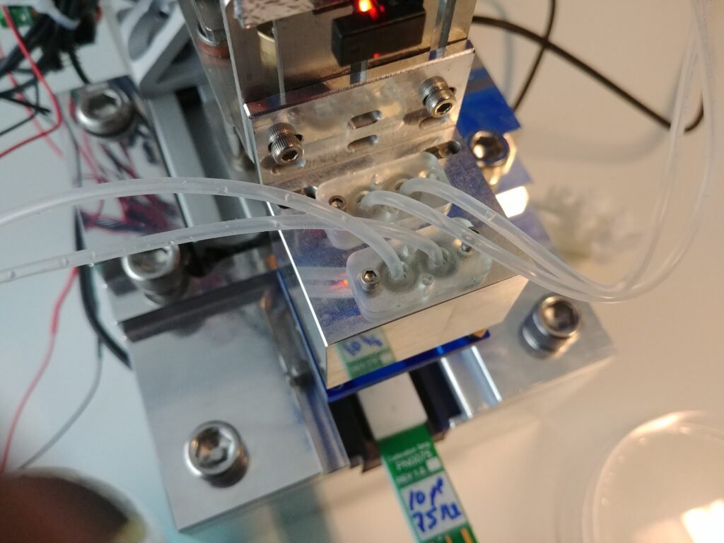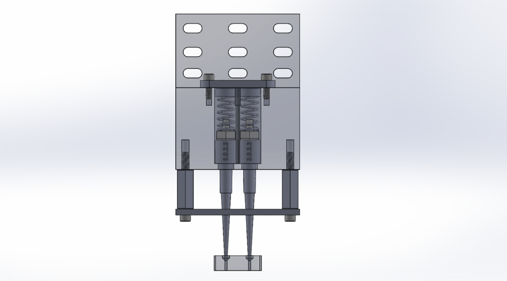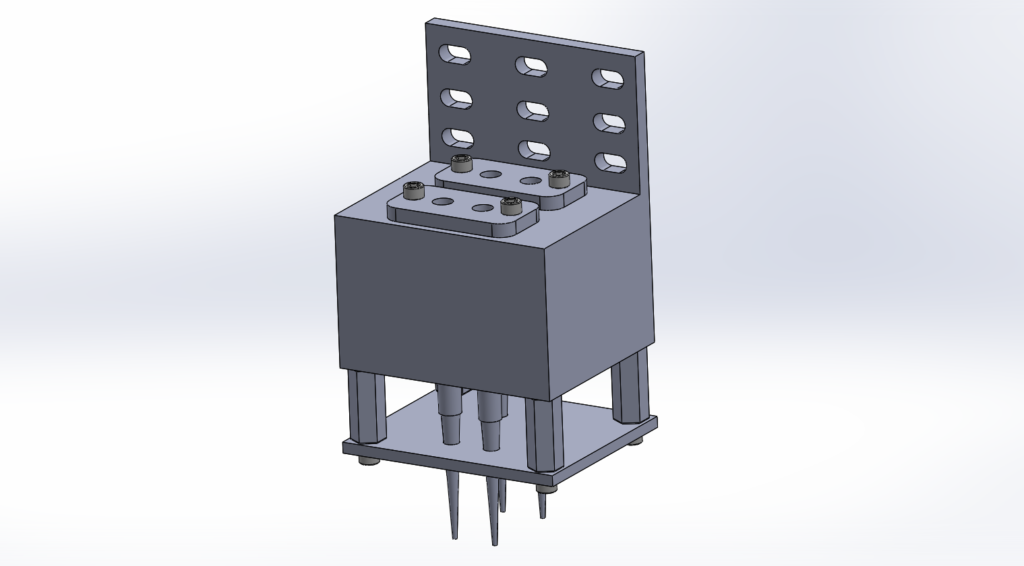 I worked on designing and building an adapter for the machine. The issue was that four pipettes had to plug into four fluid holes and seal consistently despite any slight variation in the height of the consumables used, the pipettes themselves, and any slight misalignment of the fluid ports, (about +/- 500μm).