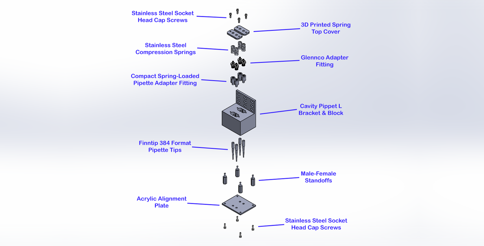 The use of springs allowed the pipettes to wiggle around just enough to align with the fluid holes if they were slightly off-centered.
