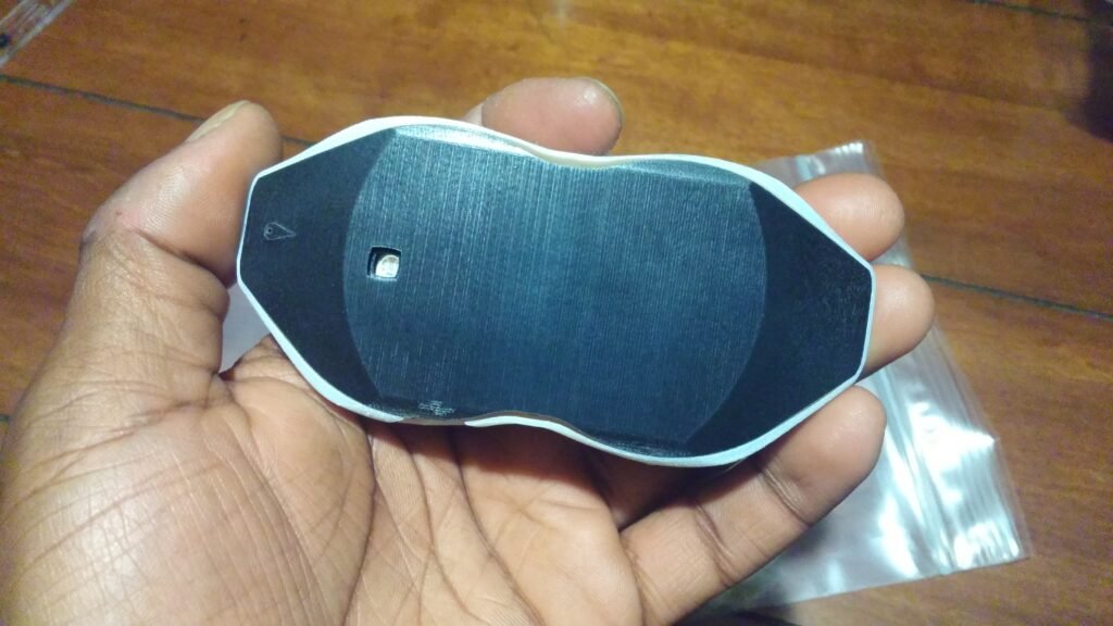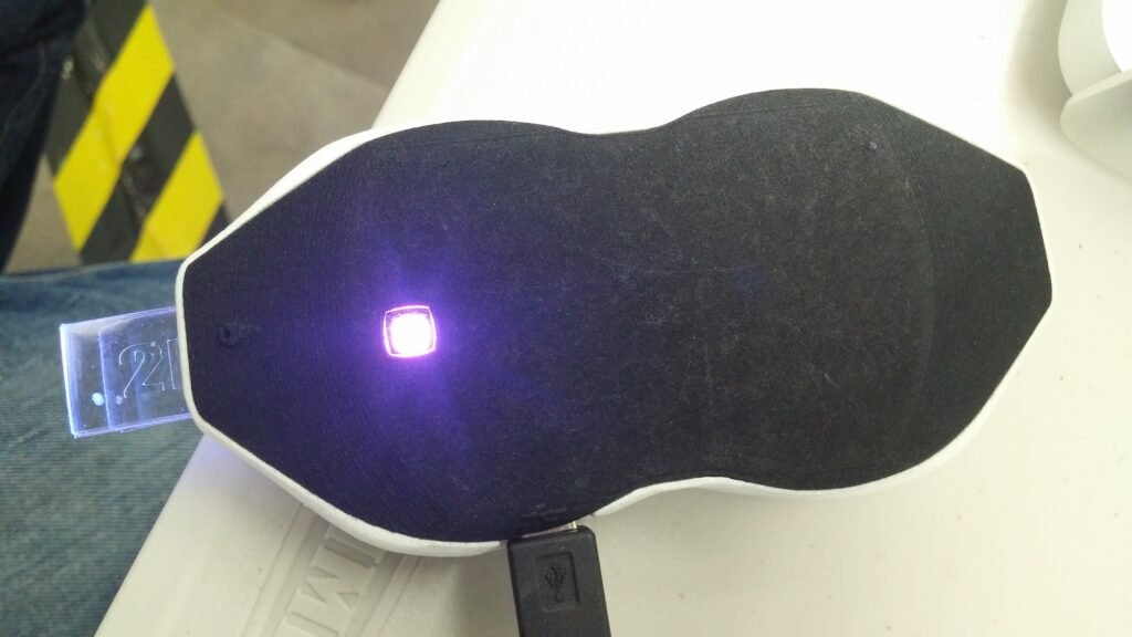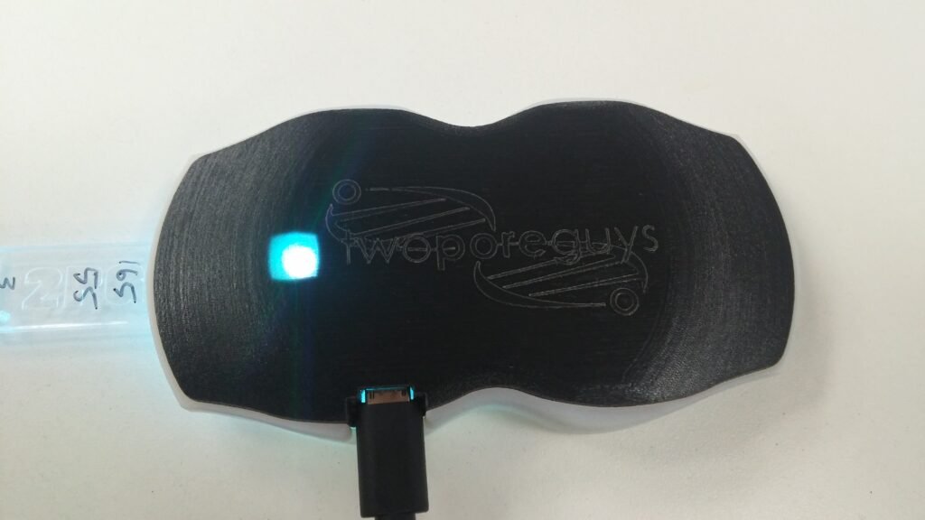 Unlike the 3D rendered illustrative design, a couple of changes were made to quickly get around hardware constraints to produce a working prototype – such as the USB placement, the lack of a screen, and there being one square light spot further in rather than two pairs of wavy light lines near the outer edge of the device.