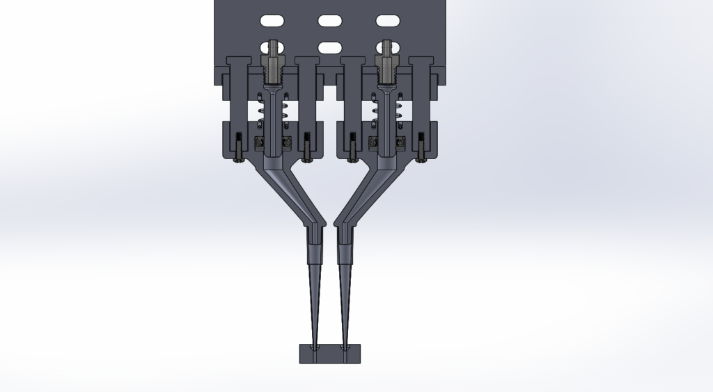 A spring-loaded design was desired to allow sealing at the fluid ports. Test strip designs were finalized at the time, meaning the fluid ports for the pipettes couldn’t be moved out.